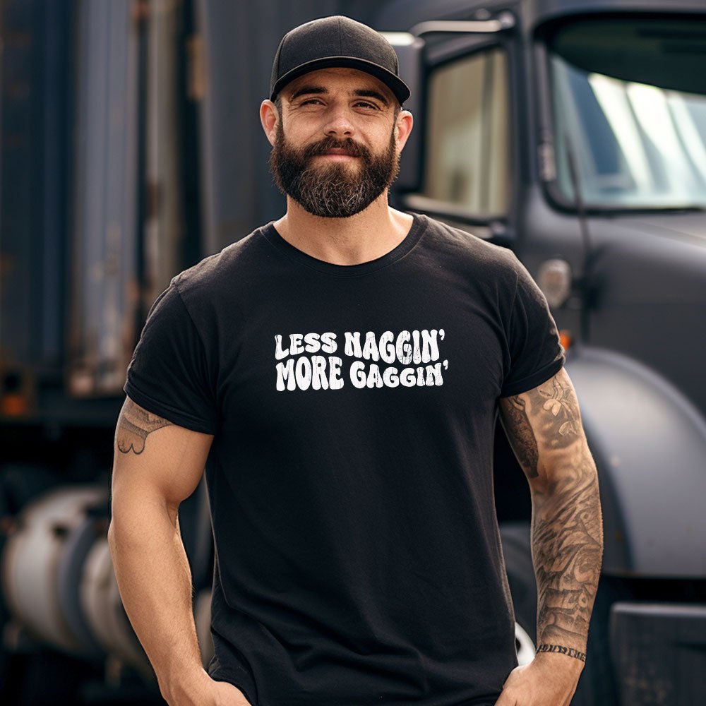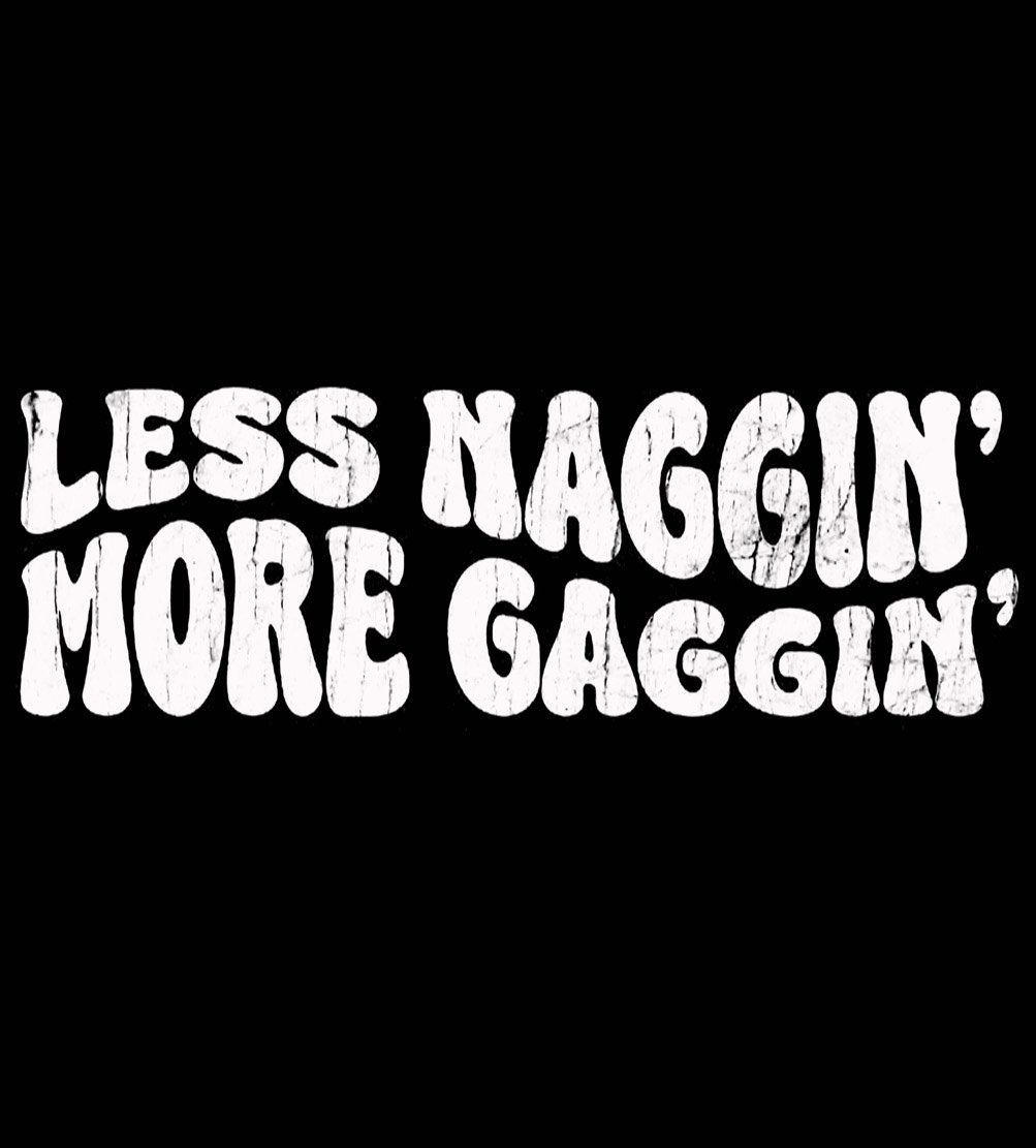 - Crank up the chaos with this bold and brutally funny tee that reads "Less Naggin More Gaggin." Designed for those who live unapologetically and speak fluent sarcasm, this graphic delivers shock value and savage energy in one punchy package. Perfect for roasting expectations and flipping the script, its ideal for bold personalities who dont mind raising eyebrows while getting laughs.